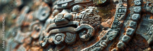 A close-up view of intricate carvings of Mayan symbols on an ancient stone artifact, showcasing the historical artistry of the civilization