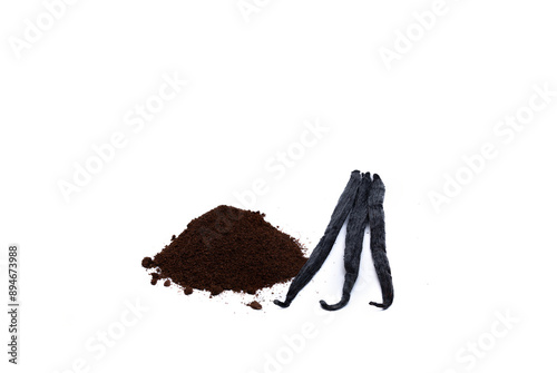 Mielona wanilia bourbon z Madagaskaru i aromatyczne laski wanilii na białym tle