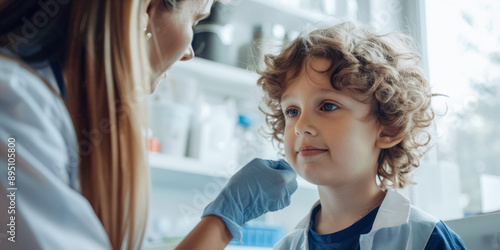 Smiling child interacting with a female doctor during a medical examination in a brightly lit clinic, highlighting care and compassion