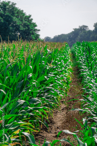 Field of growing corn in summer against the background of a beautiful blue sky. agriculture in corn season