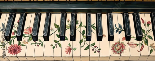 Floral Piano Keys A decorative illustration of piano keys adorned with delicate floral patterns and vines