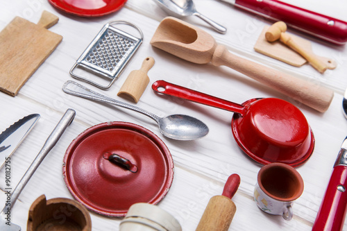 Töpfe, Pfannen und anderes Geschirr in rot weiß mit silber auf Holz als Dekoration zum Fest