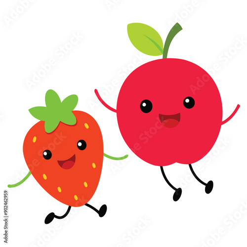 funny jumping apple and Strawberry, cartoon character, vector illustration, isolated white background