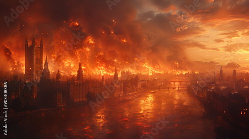 Depiction of the Great Fire of London: Flames Consuming Medieval Buildings