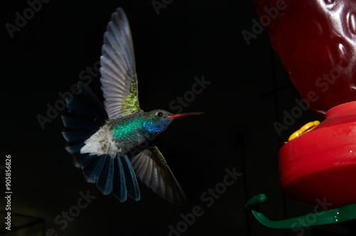 Colibrí mexicano captado al anochecer con flash, a control remoto, cerca de su comedero. Muy colorida con fondo casi negro. Suspendido en el aire.