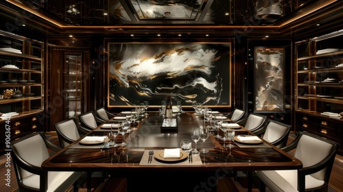 Elegant, modern dining room with luxurious decor, featuring a long table with neatly arranged chairs, stylish lighting, and sophisticated art.