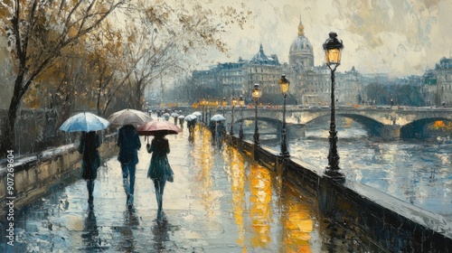 Rainy Day in Paris - People Walking Along Seine River with Umbrellas in Romantic European Cityscape Painting