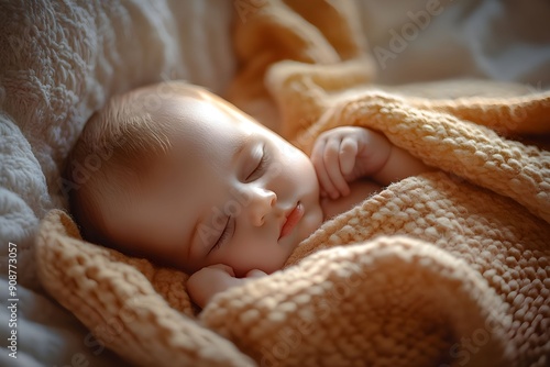 Noworodek, niemowlę, sen noworodka, śpiące dziecko, noworodek, dwa tygodnie, miękki kocyk, spokojny sen, urocza twarz, delikatne światło, przytulność, bezpieczeństwo, ciepło, tekstura, spokój,