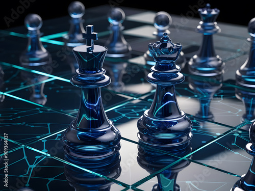 Juego de ajedrez de cristal con una pieza de rey y reina. El rey está en posición defensiva mientras la reina está preparada para atacar