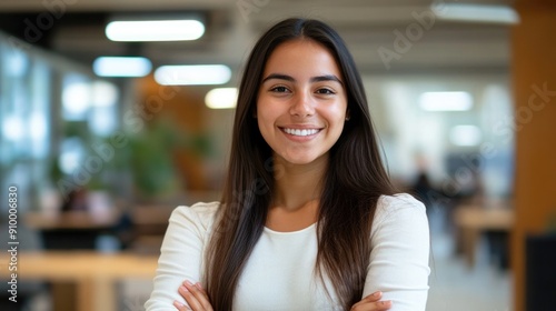 Young smiling latin girl college student or teacher looking at camera standing in university campus. Happy hispanic millennial woman professional posing in modern coworking creative office space.