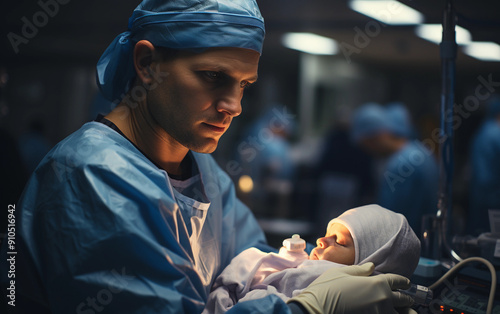 Medical professionals attend to a newborn baby in an operating room shortly after birth, ensuring the baby's health and providing immediate care