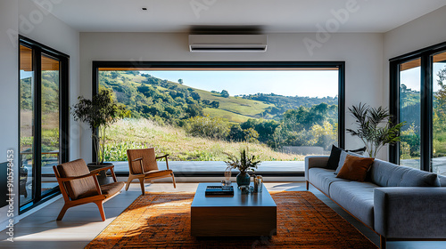 Salon avec grande baie vitrée offrant une large vue sur la montagne environnante