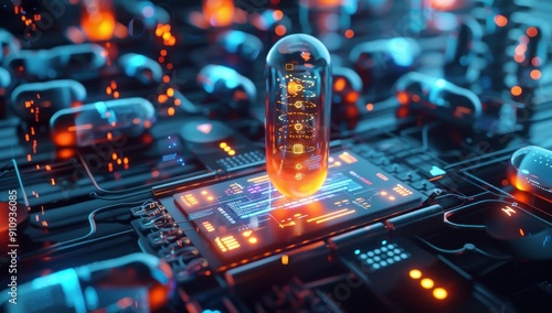 Gros plan sur une capsule électronique dans laquelle circulent des données holographiques, entourée d'autres pilules, concept pour la recherche sur les technologies de santé numérique futuriste.