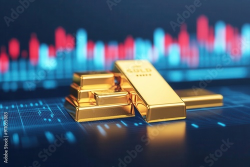 Close-up of gold bars on a financial chart background, symbolizing wealth and investment opportunities in the gold market.