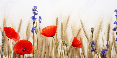 Jasne tło - żniwa. Pole zbóż z kwiatami chabrów i maków. Kłosy pszenicy i traw w miesiącu sierpniu. Ziarna do płatków śniadaniowych