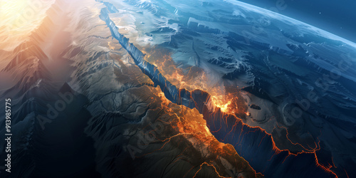 Illustration of tectonic plates shifting, with a fault line and Earth's layers highlighted, demonstrating the process of continental drift and seismic activity.