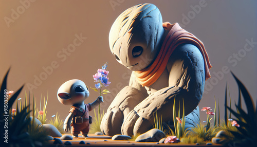 Tiny alien offers a flower to a stone golem in a fantastical setting, showcasing unlikely friends' bond.