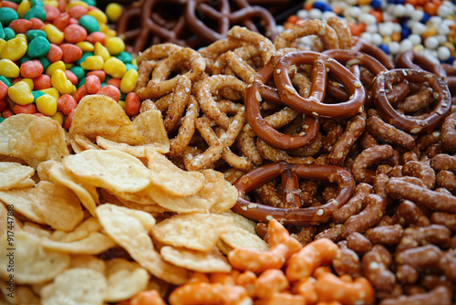 An assortment of savory snacks including chips, crackers, pretzels, and nuts
