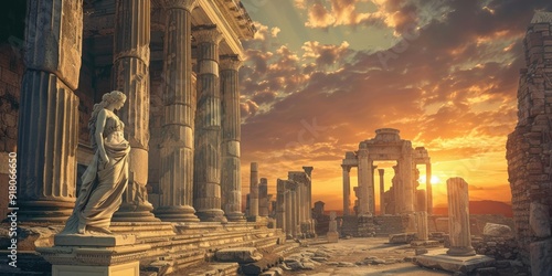 Ancient ruins at sunset with a statue.