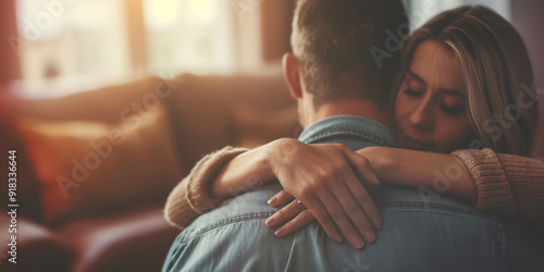 A man puts his hand on a woman's shoulder, husband supports and cares for his wife.