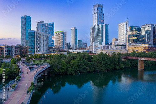 Colorado River and downtown cityskline at sunrise, Austin, Texas, United States.