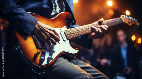 Guitarist on stage and sings at a concert for background, soft and blur concept