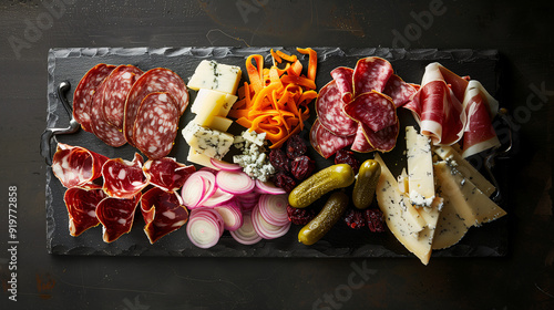 a charcuterie board with a selection of cheeses, cured meats, and fermented vegetables like pickled onions and cornichons, beautifully arranged on a dark slate board