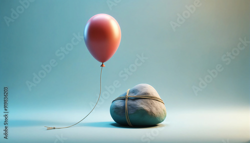Floating balloon and grounded rock tied with a string, symbolizing the bond of unlikely companions defying gravity.