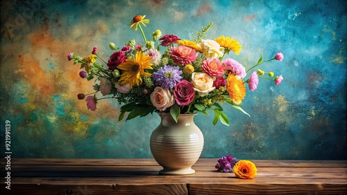 Colorful still life featuring a bouquet of fresh flowers in a classic vase , flowers, vase, arrangement, colorful, vibrant