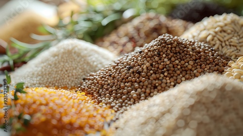 Close-up of various grains arranged with fresh herbs and spices on a white background, with sunlight creating intricate shadows and highlights, emphasizing the rich textures and colors. Detailed,