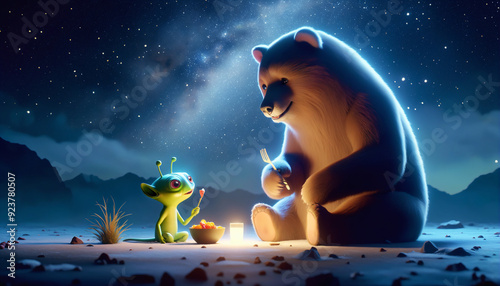 Small alien creature and giant terrestrial bear share a meal under starry sky, showcasing the bond of unlikely friends.