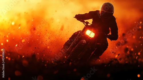 Dramatic shot of a silhouetted motorcyclist riding through dust with a vibrant orange sunset backdrop, evoking a sense of adventure and thrill.