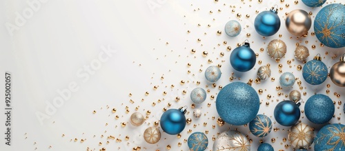 Elegant display featuring blue and gold Christmas balls on a white backdrop in a flat lay top view with copy space image