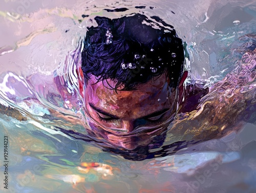 A figure partially submerged in a liquid mirror, representing the merging of conscious and unconscious selves, Fantasy, Digital painting, Reflective and fluid textures