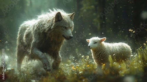 jesus sprinting towards unlikely pair majestic wolf and gentle lamb in lush green field dramatic lighting spiritual aura contrasting symbolism