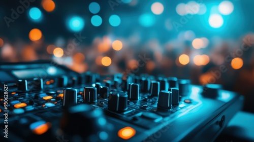 This image showcases a DJ audio mixing console glowing with vibrant lights, set against a blurred event background, capturing the essence of a lively musical ambiance.