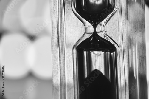 A black-and-white hourglass close-up measuring time with flowing sand transparent glass