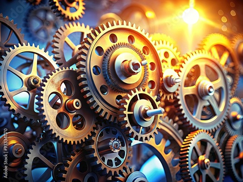 A intricate gear mechanism shifts into motion, symbolizing transformation, progress, and innovation as cogs interlock and rotate, propelling forward momentum and revolutionary growth.