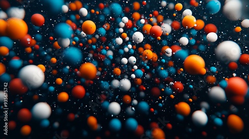 A bunch of orange and blue spheres floating in the air