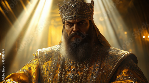 Mężczyzna z brodą w ozdobnych złotych szatach z finezyjnymi haftami i majestatyczną koroną.