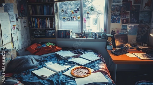 A cozy and cluttered bedroom scene with a unmade bed, notebooks, and a pizza on the covers, capturing a moment of casual studying and relaxation in a creative space.