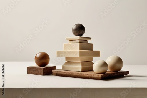 Different geometric shaped objects square half ring spheres and rectangle plank placed balancing on tip of cream pyramid on white ground