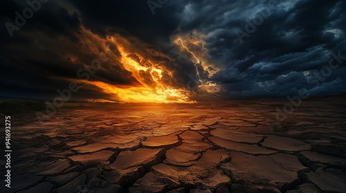 Porywający widok suchej, popękanej ziemi pod groźnym, burzowym niebem, eksponujący siłę natury i skutki ekstremalnych warunków pogodowych.