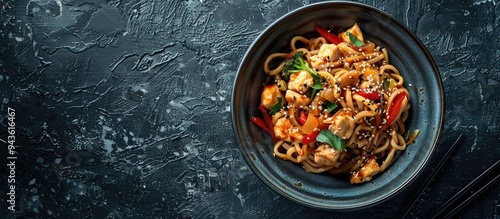 Copy space image of a bowl with udon stir fry noodles chicken and sesame on a dark stone surface