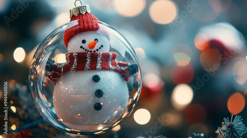 Szczęśliwy bałwanek uwięziony w bombce choinkowej, która wisi na tle śnieżnej zimowej scenerii.