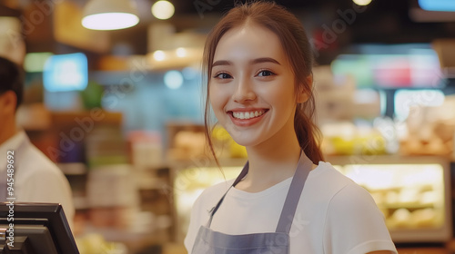 Atrakcyjna, młoda sprzedawczyni przy kasie, serdecznie uśmiechająca się do klientów.