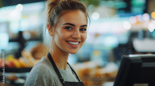 Atrakcyjna, młoda sprzedawczyni przy kasie, serdecznie uśmiechająca się do klientów.