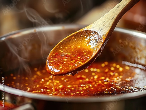 Wooden spoon with sauce stirring a simmering pot of sauce
