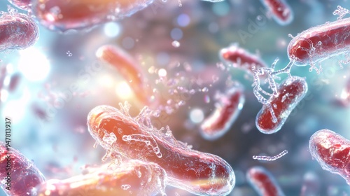A detailed, abstract representation of biological processes, showing the interaction between plasma and bacteria under a microscope.