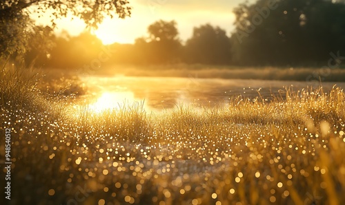 Serene Sunrise Over Dew-Covered Meadow with Golden Light and Calm River, Peaceful Ambiance, Photo Realistic